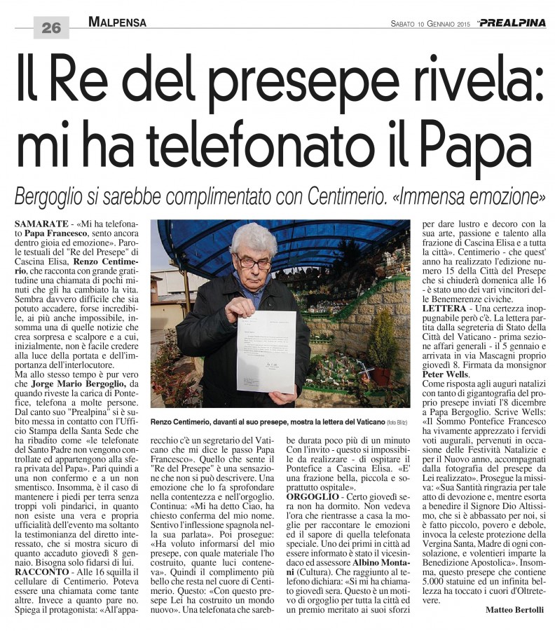E poi quel momento che resterà per lui impresso nella storia e quella telefonata davvero speciale. Lo aveva raccontato lui stesso colmo di emozione e di gratitudine a La Prealpina undici anni fa. Era il 2015 quando ricevette una telefonata dalla Città del Vaticano e quando gli passarono il compianto papa Francesco che si informò sul suo presepe e si complimentò per la sua creazione. E Centimerio commentò a caldo: «È stata un’emozione incredibile e un momento indescrivibile».